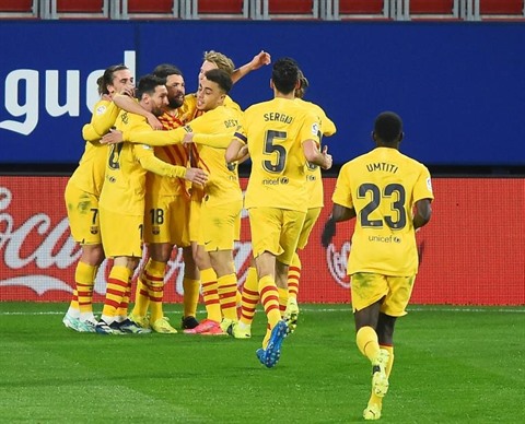 Le printemps est déjà là en Catalogne : dans le sillage de leur exploit contre Séville mercredi en demi-finale de Coupe d'Espagne (3-0) et avant le scrutin présidentiel de dimanche 7 mars, les Catalans se sont offert une précieuse victoire en terre navarraise grâce à un boulet de canon signé Jordi Alba, bien servi par son maître à jouer Lionel Messi (30e), et un but du jeune Ilaix Moriba en fin de match (82e).