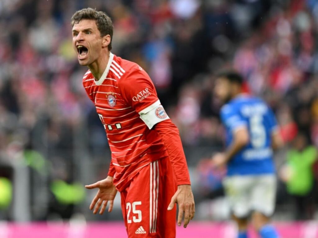 | L'attaquant du Bayern Thomas Müller mécontent lors du match nul concédé contre Hoffenheim, le 15 avril à Munich. |