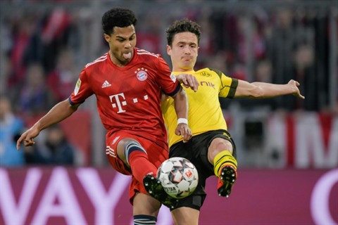| Le milieu du Bayern Serge Gnabry (gauche) à la lutte avec le milieu danois de Dortmund Thomas Delaney, le 6 avril à Munich. |