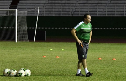 | Le Belge Marc Wilmots, alors sélectionneur de la Côte d'Ivoire, lors d'un entraînement à Abidjan, le 3 octobre 2017. |