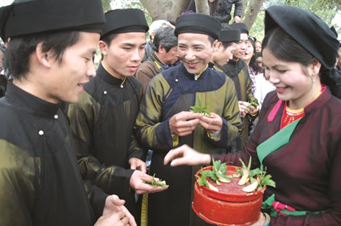 | Lors de la Fête de Lim à Bac Ninh (Nord), avant leur représentation de "quan ho" (chant alterné), les chanteuses offrent aux invités des chiques de bétel. |