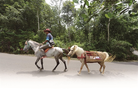| Ridwan Sururi sur le dos de Germanis, suivie par Luna, en route vers le village de Serang, sur l’île indonésienne de Java. |