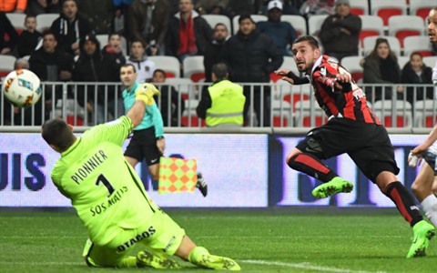 | Le Niçois Mickaël Le Bihan (droite) inscrit un but contre Montpellier, le 24 février à l'Allianz Riviera. |