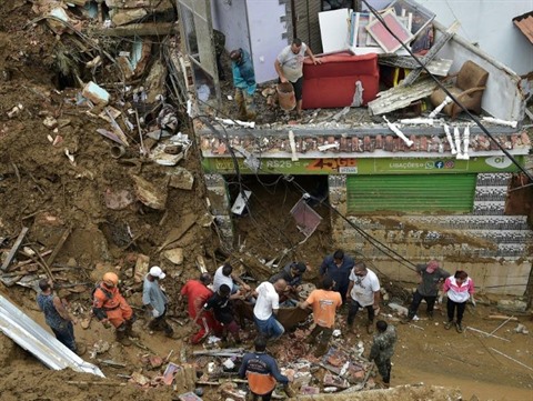Des habitants évacuent le corps d'une victime après des glissements de terrain et des inondations à Petropolis, le 16 février au Brésil. Photo : AFP/VNA/CVN |