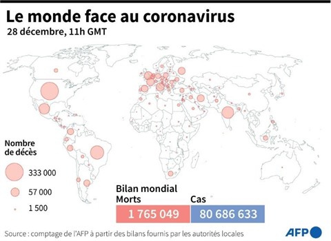 | Nombre de morts liés au coronavirus officiellement annoncés par pays, au 28 décembre à 11h00. |
