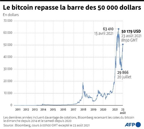 | Le bitcoin est repassé le 23 août à 08h50 GMT au-dessus des 50.000 USD, après plus de 3 mois sous ce seuil. |