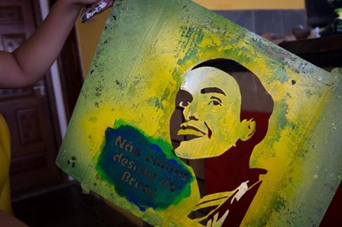 | Des fans de la candidate Marina Silva brandissent un t-shirt où son portrait a été peint, le 4 octobre à Rio Branco |
