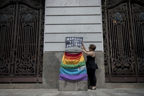 | Une femme dépose une pancarte et un drapeau arc en ciel devant le Conseil municipal de Rio au cours des funérailles de Marielle Franco, le 15 mars 2018. |