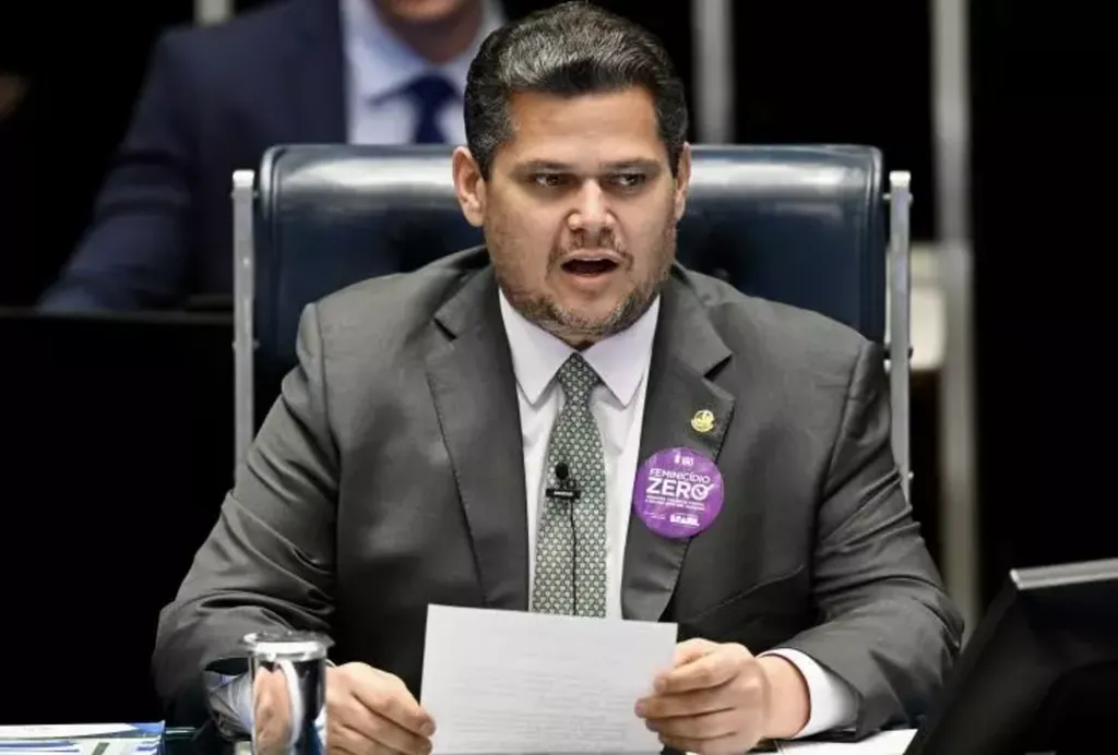 | Le président du Sénat brésilien, Davi Alcolumbre, lors d'une session consacrée au vote sur l'approbation de l'accord de libre-échange entre le Mercosur et l'Union européenne, le 4 mars à Brasilia. |
