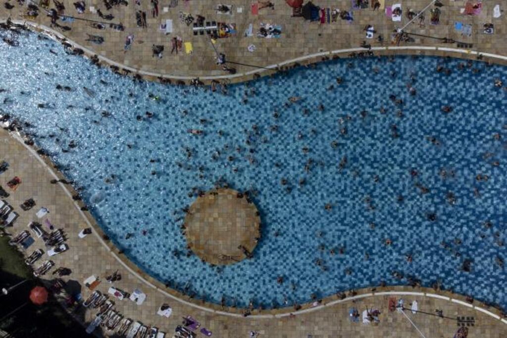 | Vue aérienne d'une piscine bondée à Sao Paulo, lors d'une vague de chaleur, le 17 mars au Brésil. |