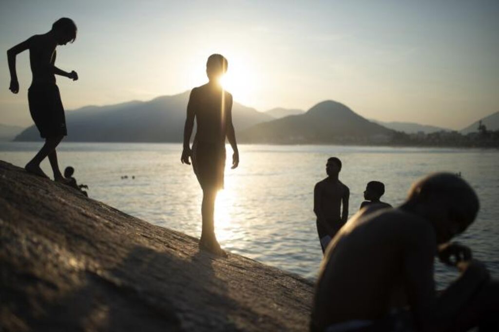 | Des baigneurs sur une plage de Rio pendant une vague de chaleur, le 17 mars au Brésil. |