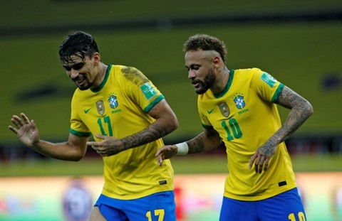 | Neymar (droite) célèbre son but sur penalty pour le Brésil contre l'Equateur en compagnie de son coéquipier Lucas Paqueta, à Porto Alegre, le 4 juin. |
