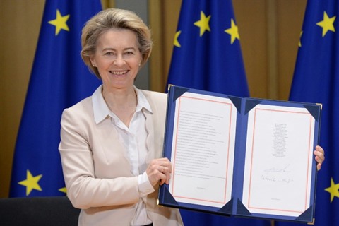 | La présidente de la Commission européenne, Ursula von der Leyen, pose avec l'accord post-Brexit signé à Bruxelles, le 30 décembre. |