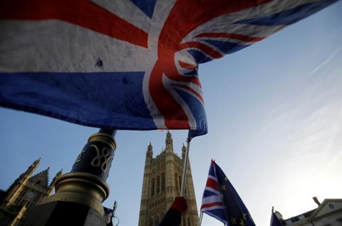 | Drapeaux britannique et européen devant le Parlement britannique, le 17 décembre 2018 à Londres. |