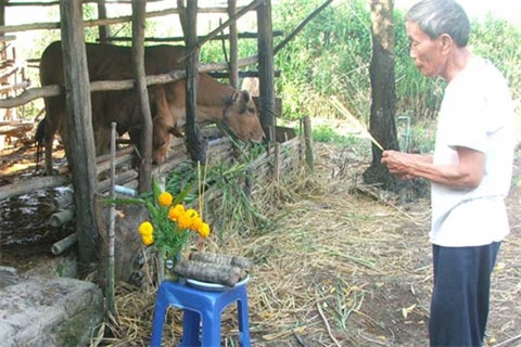 Quelques jours avant le Têt traditionnel, l’herbe jeune est récoltée et la paille récupérée et séchée pour récompenser le buffle à l’occasion du Nouvel An. Dans l’après-midi du 30 décembre lunaire, le buffle est lavé, l’écurie récurée, l’auge pleine d’herbe, de maïs, de paille : les plats préférés du buffle. Le matin du premier jour de la Nouvelle Année, une amulette est collée sur le front du buffle pour faire fuir les mauvais esprits et tourner la page des mauvaises fortunes de l’année écoulée. Une petite table est placée devant l’écurie avec des offrandes telles que du bánh chung (gâteau de riz gluant carré), bánh tét (gâteau de riz gluant sous forme de cylindre), du poulet, du vin…
