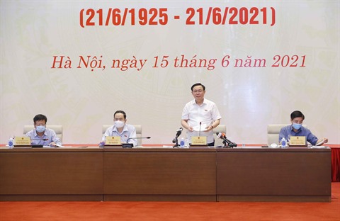 | Le président de l’Assemblée nationale Vuong Dinh Huê (debout), le 15 juin à Hanoï. |