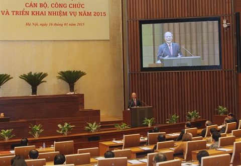 | Le président de l'Assemblée nationale (AN), Nguyên Sinh Hùng, s'adresse à la réunion de mise en oeuvre des tâches pour 2015 du bureau de l'AN, le 16 janvier à Hanoi. |