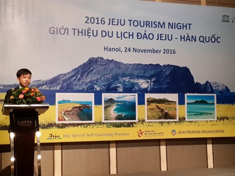 | Vu Phi Hùng, chef du Bureau de représentation du Service du tourisme de Jeju, prend la parole, le 24 novembre à Hanoï. |