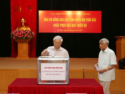 | Le secrétaire général du PCV, Nguyên Phu Trong (gauche), et l'ancien secrétaire général Lê Kha Phiêu participent à une collecte de fonds en faveur des victimes des récentes crues dans les provinces montagneuses du Nord |