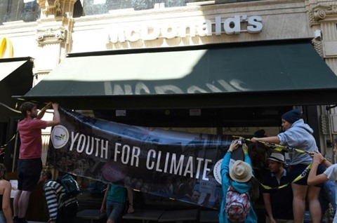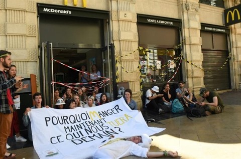 | Des militants du mouvement écologiste Youth For Climate France placardent une banderole sur un restaurant McDonald's le 14 juillet 2019 à Bordeaux. |