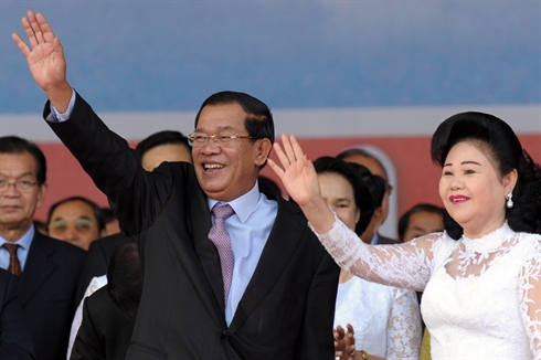 | Le Premier ministre cambodgien Hun Sen (centre) à la cérémonie marquant le 35e anniversaire de la victoire sur les Khmers rouges, 7 janvier sur l'île de Diamant. |