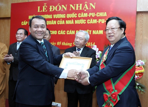 | L’ambassadeur du Cambodge au Vietnam, Hul Phany (gauche), remet le 5 septembre à Hanoi l’Ordre royal du Sahametrei du Cambodge au président de l’Union des organisations d’amitié du Vietnam, Vu Xuân Hông. |
