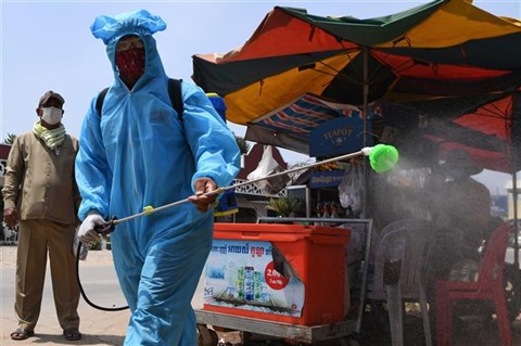 | Un agent pulvérise du produit désinfectant dans une zone résidentielle dans la province de Kandal au Cambodge. |