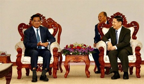 | Le vice-Premier ministre, Samdech Krolahom Sar Kheng (gauche), et le ministre laotien de la Sécurité publique, Vilay Lakhamfong, lors de la réunion. |