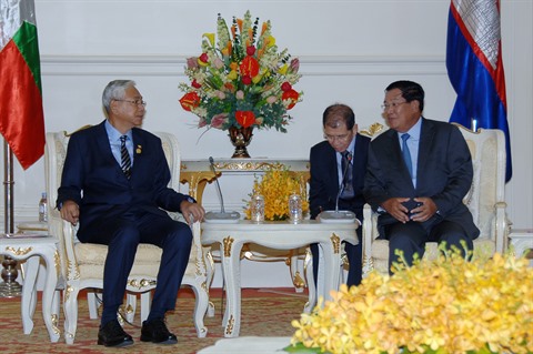 | Le Premier ministre cambodgien Samdech Techo Hun Sen (droite) et le président birman U Htin Kyaw, le 4 février à Phnom Penh. |