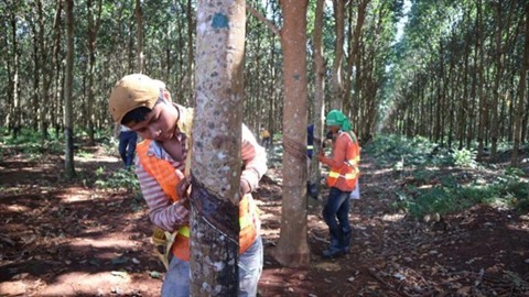 | Des travailleurs à la plantation de caoutchouc Socfin Cambodia dans la province de Mondulkiri. |