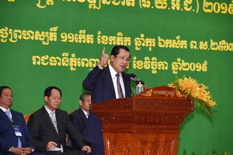 | Le Premier ministre Samdech Akka Moha Sena Padei Techo Hun Sen lors de la cérémonie de lancement du Plan stratégique de développement national 2019-2023, le 7 novembre à Phnom Penh. |