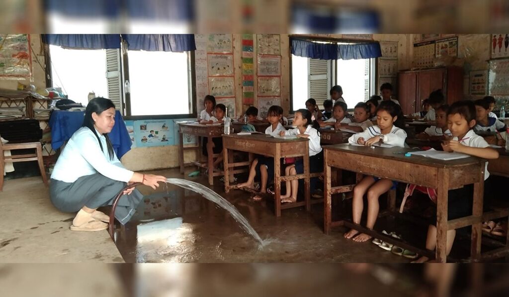 | Au Cambodge, un enseignant pulvérise de l'eau sur le sol pour réduire la chaleur dans la classe. |