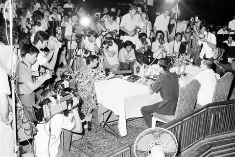 | Conférence de presse du 1er mai 1983 par le ministère cambogien des Affaires étrangères, annoncant le retrait des soldats volontaires vietnamiens. |