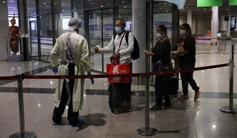 | Le personnel médical contrôle le certificat sanitaire des passagers à l'aéroport international de Phnom Penh. |
