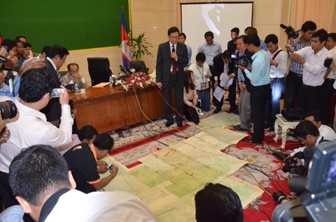 | Le ministre d’État cambodgien et chef du Comité de frontière du Cambodge, Var Kimhong (au micro), rend publique une carte officielle du gouvernement de ce pays, le 2 juillet à Phnom Penh. |