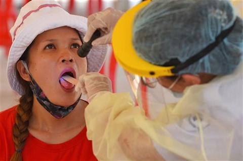 | Une agente médicale prélève les échantillons pour le test de dépistage du COVID-19 à Phnom Penh. |