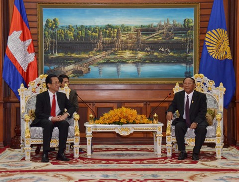 | Le président de l’Assemblée nationale cambodgienne, Samdech Heng Samrin (droite) et l'ambassadeur vietnamien au Cambodge, Thach Du. |