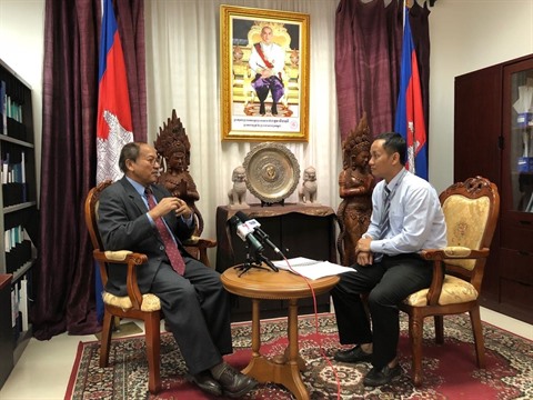 | Le ministre Phay Siphan (gauche), porte-parole du bureau du Conseil des ministres du Cambodge, lors de l'interview accordée à la VNA. |
