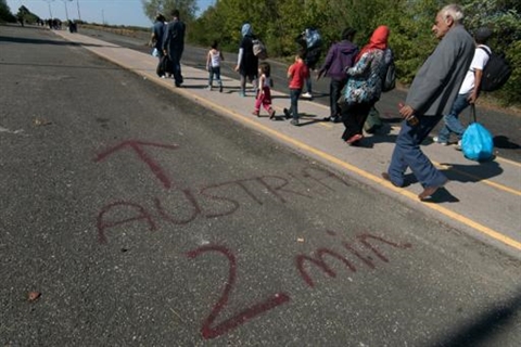 | Des migrants passent près d'un message "Autriche-2 minutes", écrit au sol à la frontière austro-hongroise, près de Nickelsdorf, du côté autrichien, le 12 septembre 2015. |