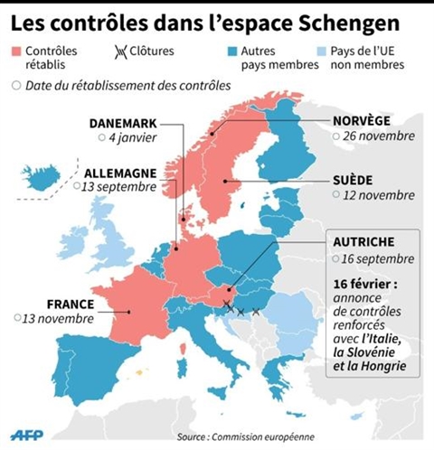 L'Autriche a annoncé le 16 février l'introduction de contrôles généralisés à ses frontières avec l'Italie, la Slovénie et la Hongrie pour "freiner" les entrées de demandeurs d'asile en sécurisant douze points de passage avec ces voisins, y compris avec des clôtures si nécessaire.