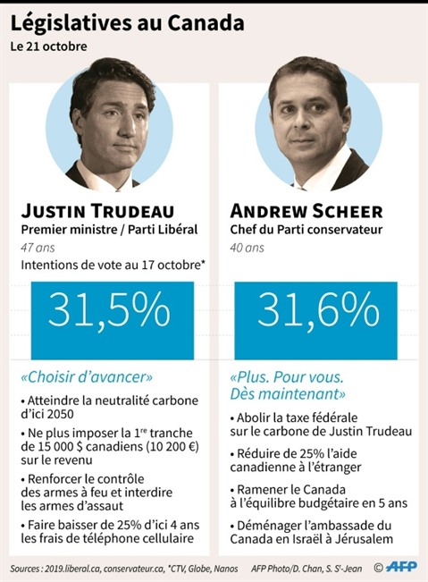 Les derniers sondages placent le parti libéral (centre) de M. Trudeau entre 31 et 34% et les conservateurs (droite) entre 32 et 33%. Selon les projections, ces chiffres ne permettraient à aucun de ces deux partis de franchir la barre des 170 sièges qui garantit une majorité absolue.
