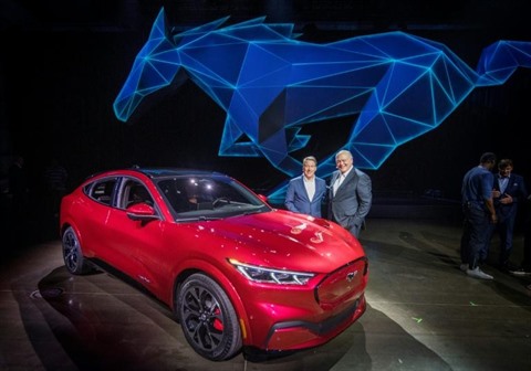 | Le PDG de Ford James Hackett (droite) présente la Mustang Mach-E, sa première Mustang électrique, à Hawthorne, Californie, le 17 novembre 2019. |