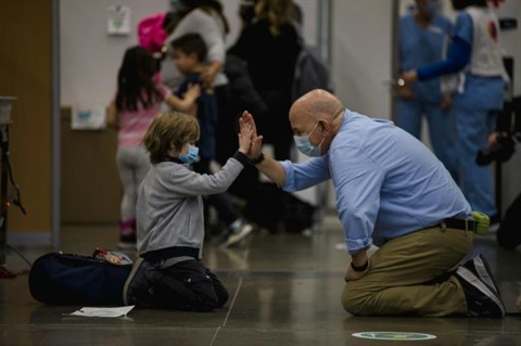 | Un enfant dans un centre de vaccination à Montréal. |