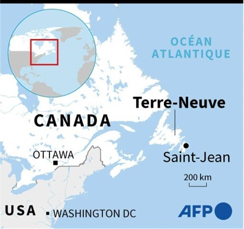 | Carte localisant l'île de Terre-Neuve au Canada, au large de laquelle un chalutier espagnol a fait naufrage |