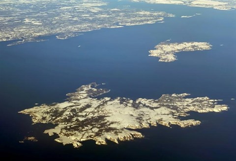 | Vue aérienne d'une île au sud de Saint-Jean, à Terre-Neuve. |