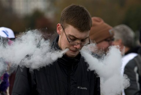 | Un manifestant vapote lors d'un rassemblement devant la Maison Blanche contre l'interdiction du vapotage arômatisé, à Washington, le 9 novembre. |