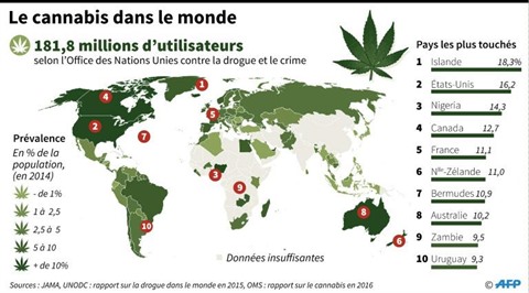 Après l'Uruguay, le Canada deviendrait le second pays à légaliser la consommation de cannabis à usage récréatif. Aux États-Unis, moins d'une dizaine d'États, dont la Californie, l'ont autorisé pour un usage récréatif.