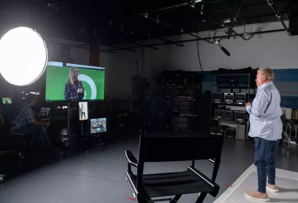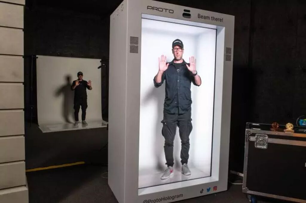 | Le patron de Proto, David Nussbaum, s'enregistre pour apparaître sous forme d'hologramme dans une boîte conçue par son entreprise, le 1er août à Van Nuys, en Californie. |