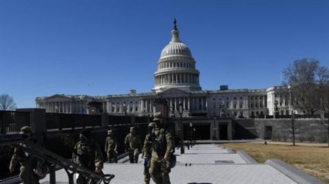 | Des membres de la Garde nationale devant le Capitole à Washington le 3 mars. |
