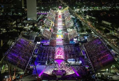 | Vue aérienne du sambodrome lors du défilé des écoles de samba au carnaval de Rio de Janeiro, le 22 avril. |